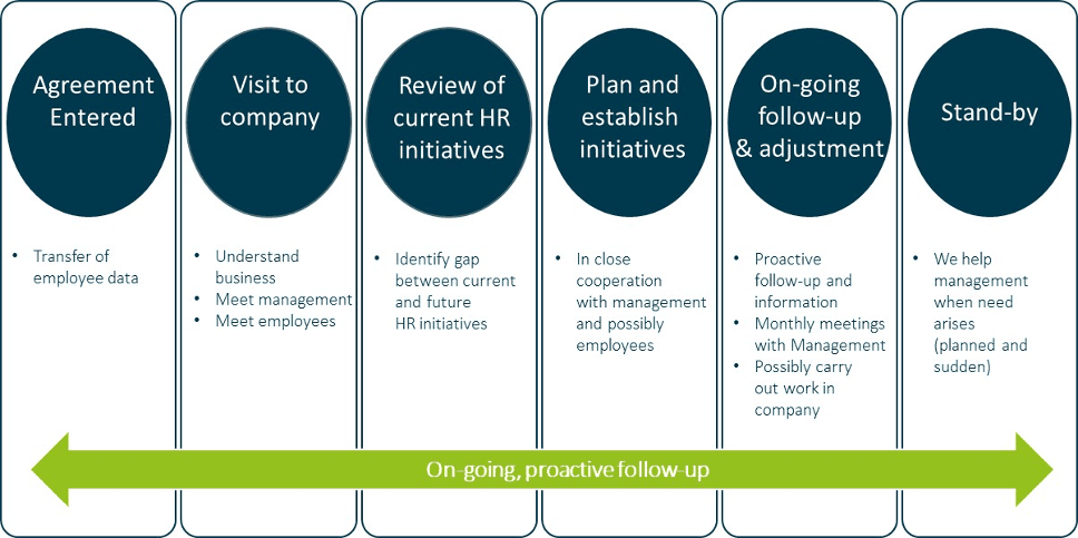 In close collaboration with you and your management team, we will custom-make your HR department to match your company needs. We review your current HR initiatives, define your future need and work towards our new, common goal.